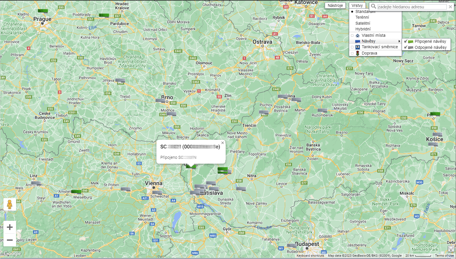 Všechny tyto způsoby identifikace vedou k tomu, že uživatel vidí připojené a odpojené návěsy na mapě.
